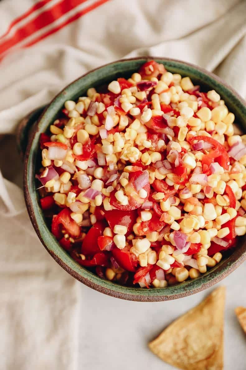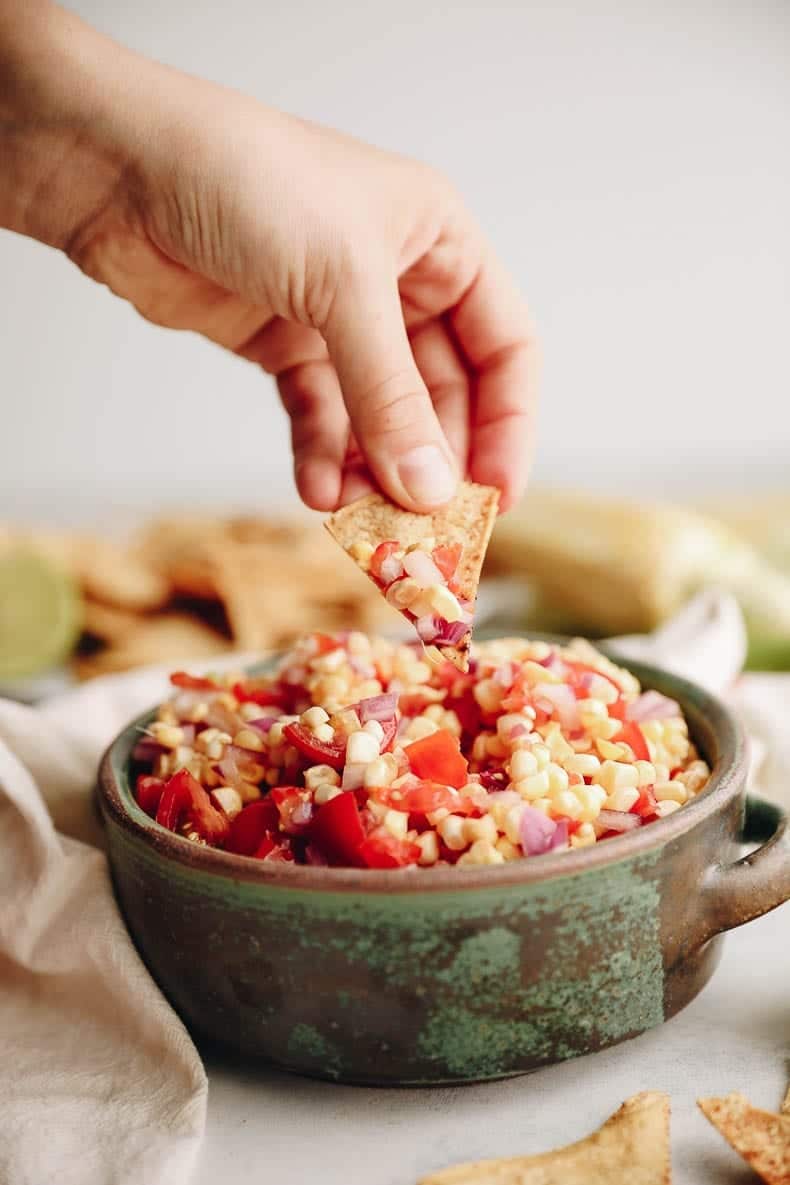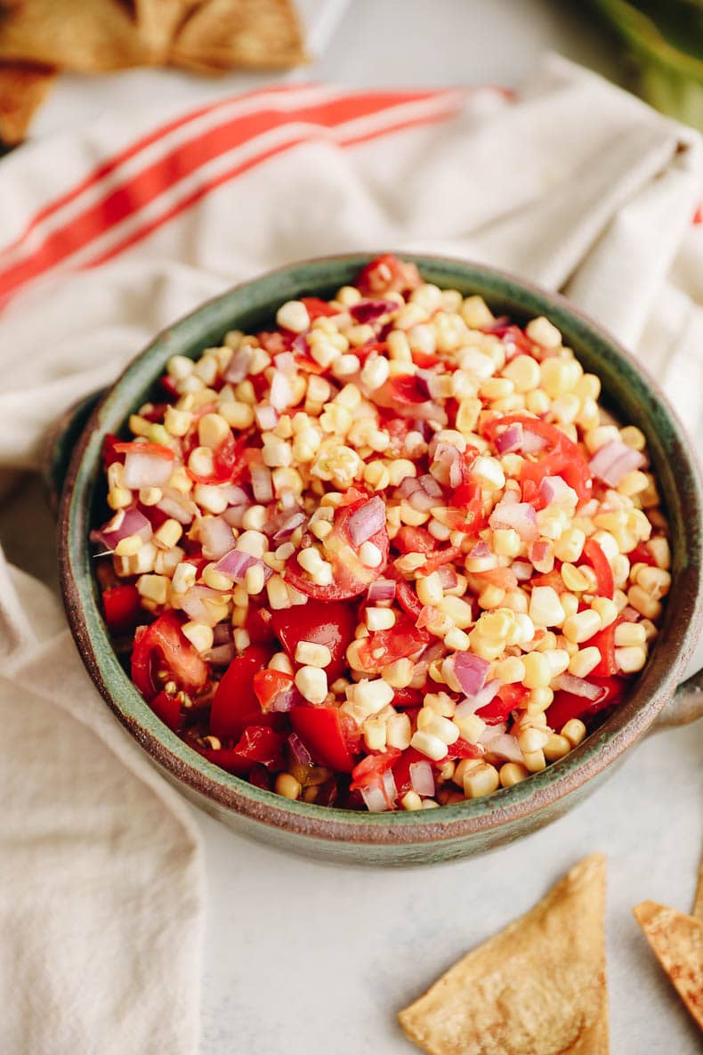 Get the best of summer with this fresh corn salsa paired with crispy baked chili lime tortilla chips. Made with sweet corn, fresh corn, onion and a little kick, this corn salsa recipe will become the official salsa of summer!