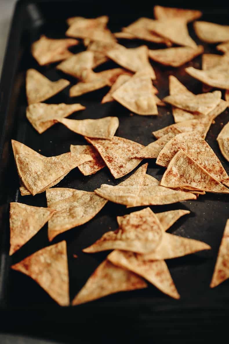 That’s it! Plus no frying required. Just cut, sprinkle and bake for healthy homemade tortilla chips. Full recipe below.