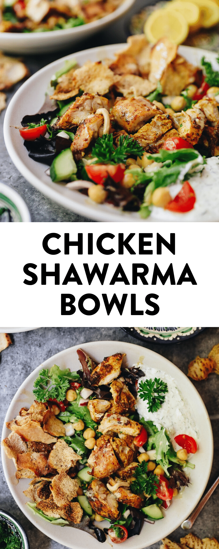 Get the best of the Middle East with this deconstructed chicken shawarma bowl. Made with oven-roasted chicken thighs, crispy pita chips and a delicious Israeli chickpea salad this healthy dinner recipe will quickly become a family favorite.