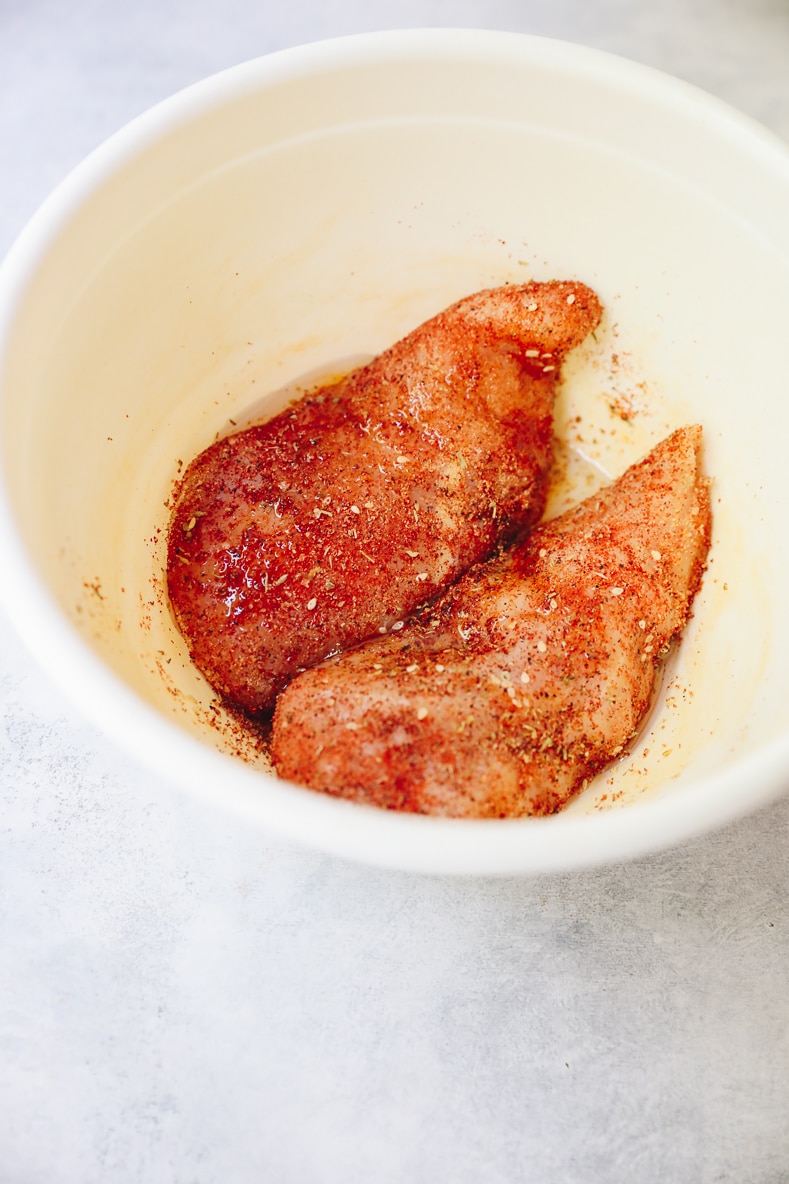 STEP 2: Place chicken in a bowl and top with olive oil, garlic powder, paprika, za’atar + sea salt. Let marinate for 20 minutes.