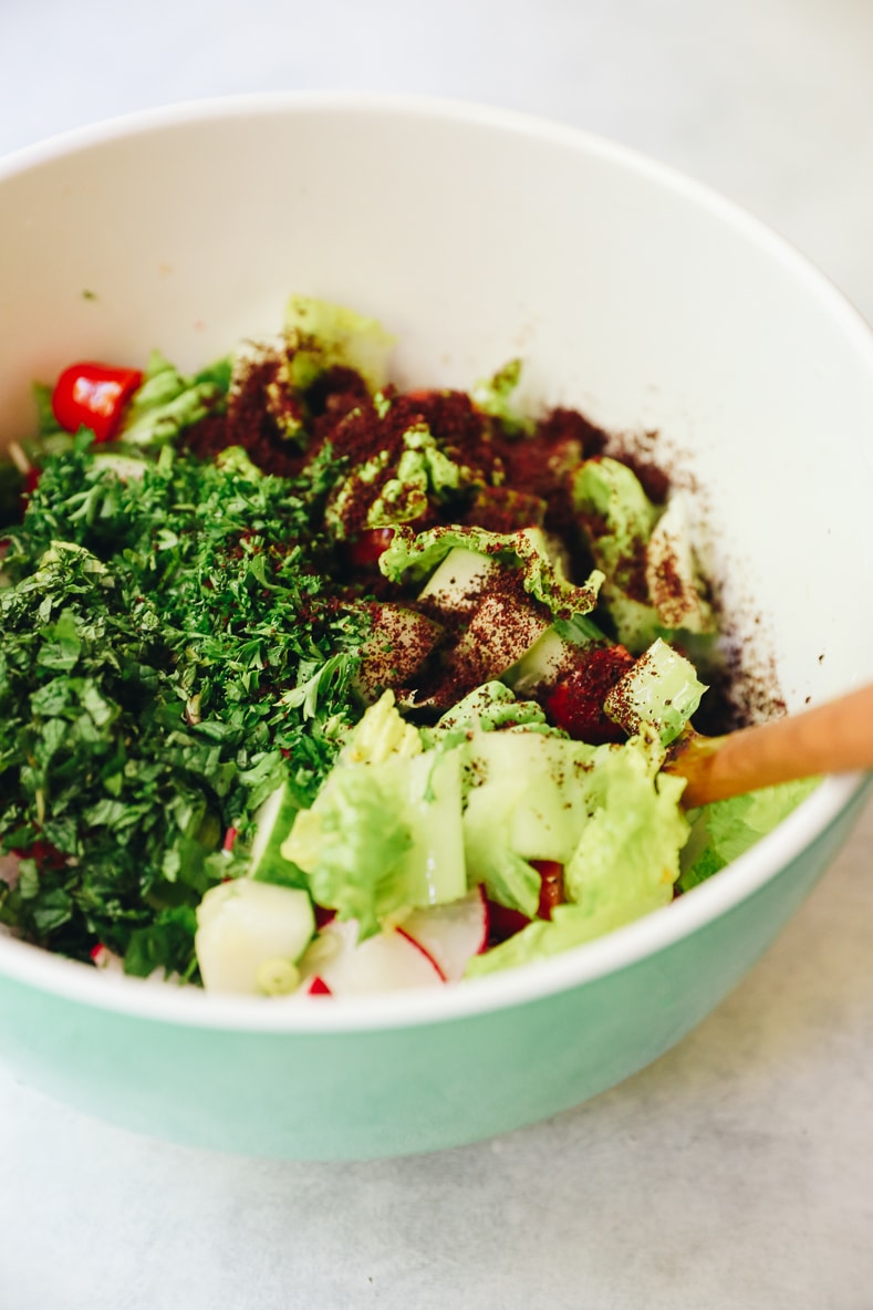 Fattoush salad is a traditional staple in Lebanese cooking. It typically combines crispy bread known as “khubz” or pita with greens and a medley of vegetables including tomatoes, cucumber and radishes. It is topped with a simple olive oil + lemon dressing and a sprinkling of sumac.