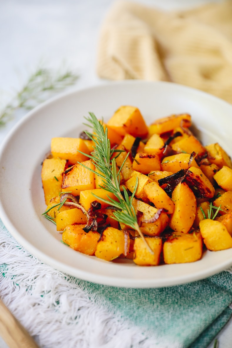 A simple fall side dish for roasted butternut squash with rosemary. Just toss with onion and olive oil and roast to perfection with a subtle hint of rosemary for flavor.