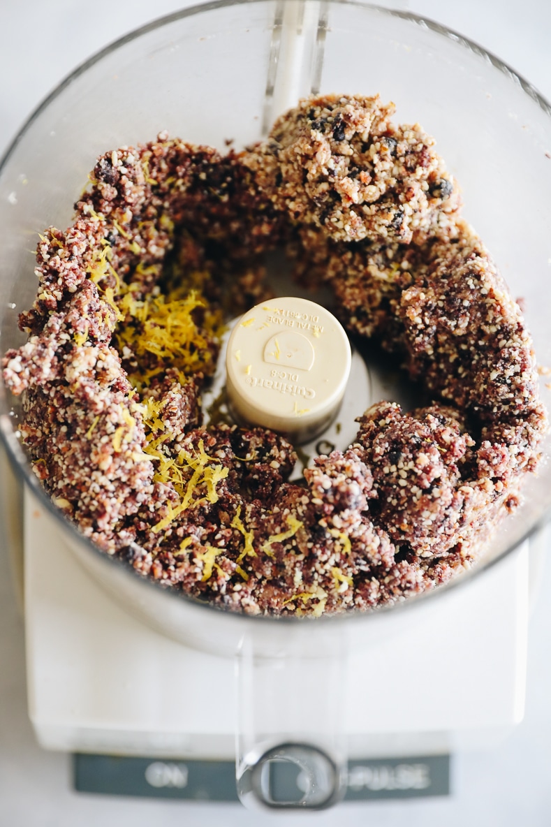 STEP 2: Combine nuts with dates and dried blueberries and process until all ingredients have broken down and are a bit sticky.