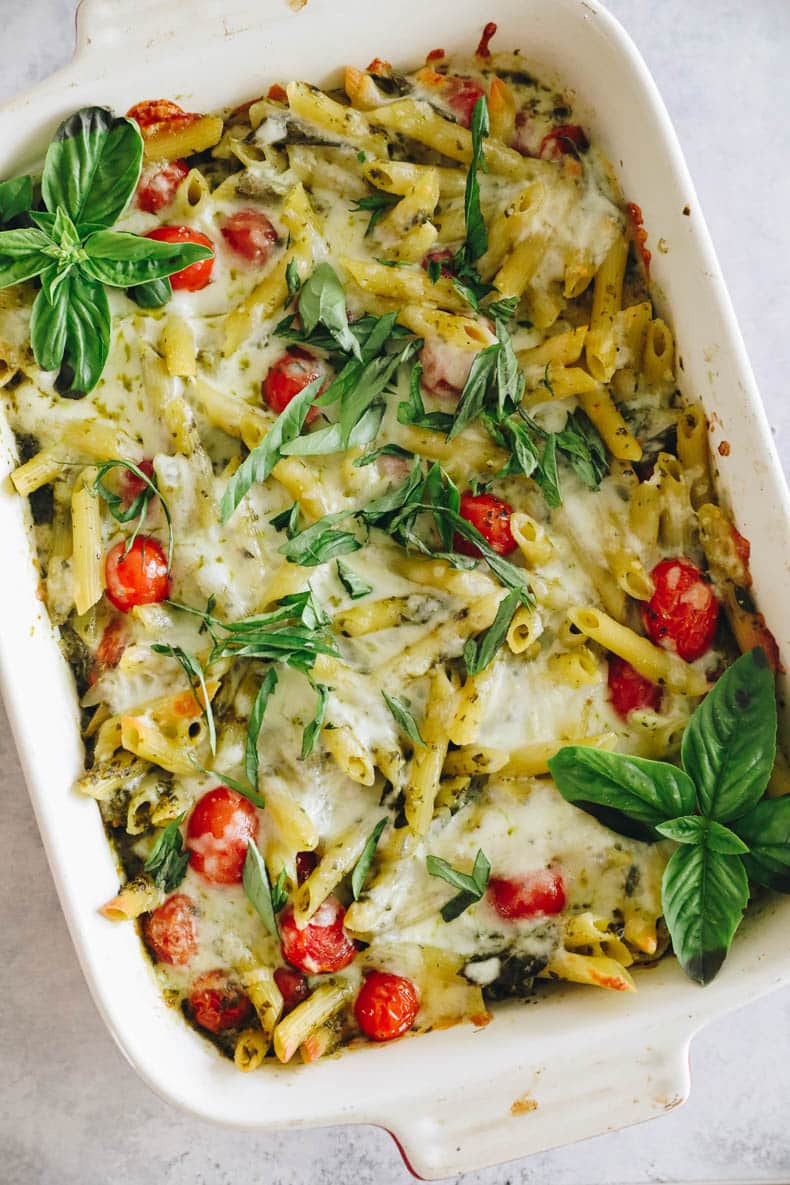 If you can’t tell I’ve been on a major one pan recipe. This pesto pasta bake is no exception! All you need are 10 simple ingredients and a casserole dish to have dinner on the table tonight.