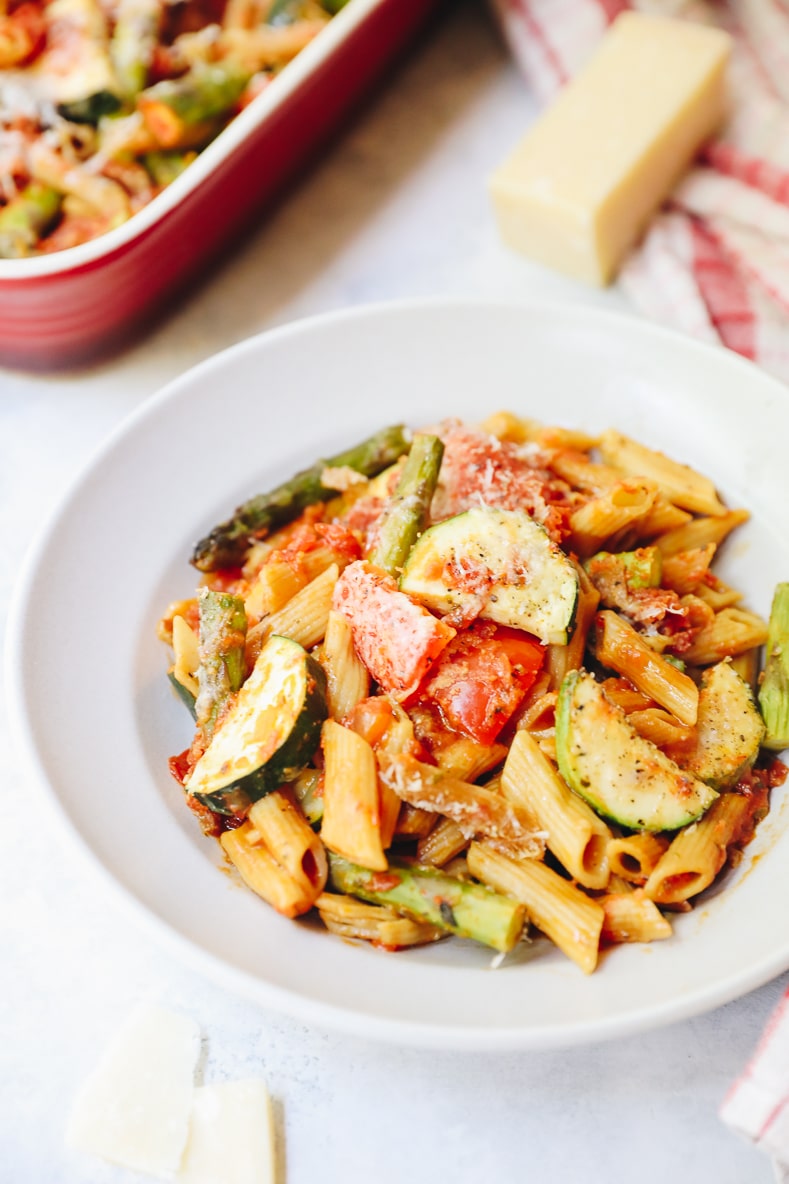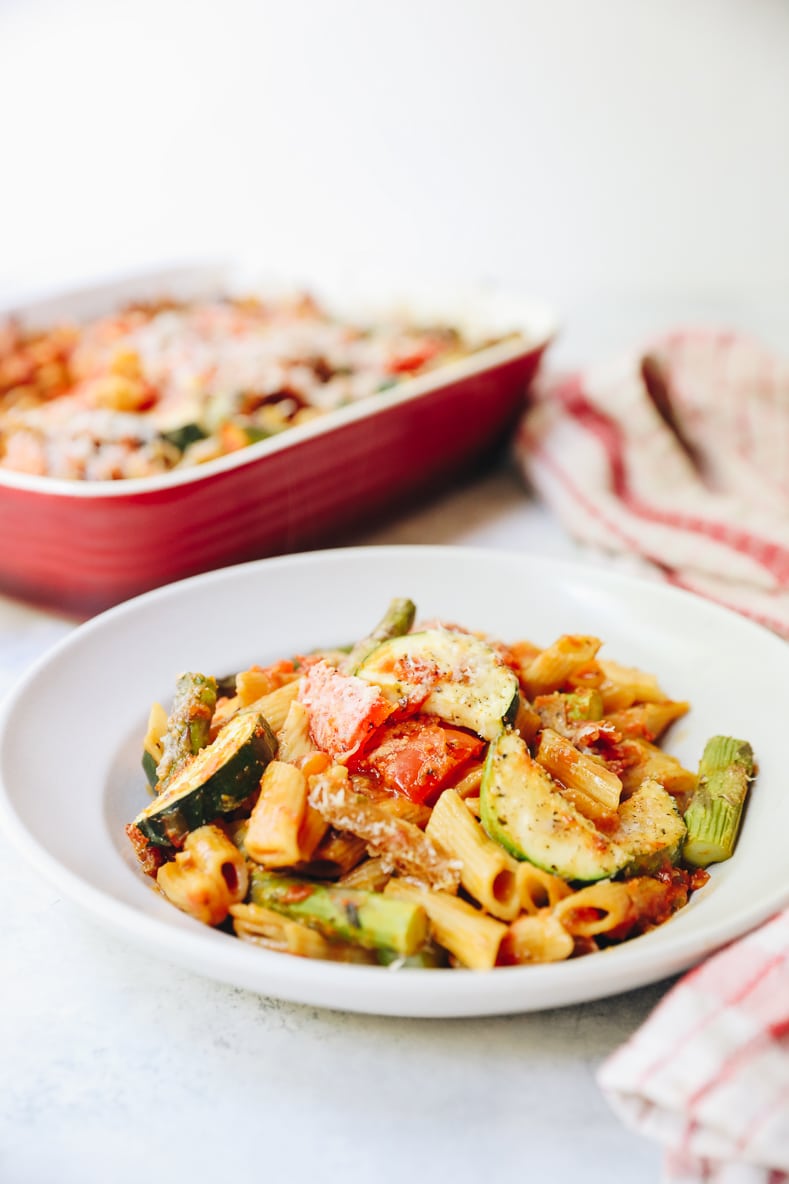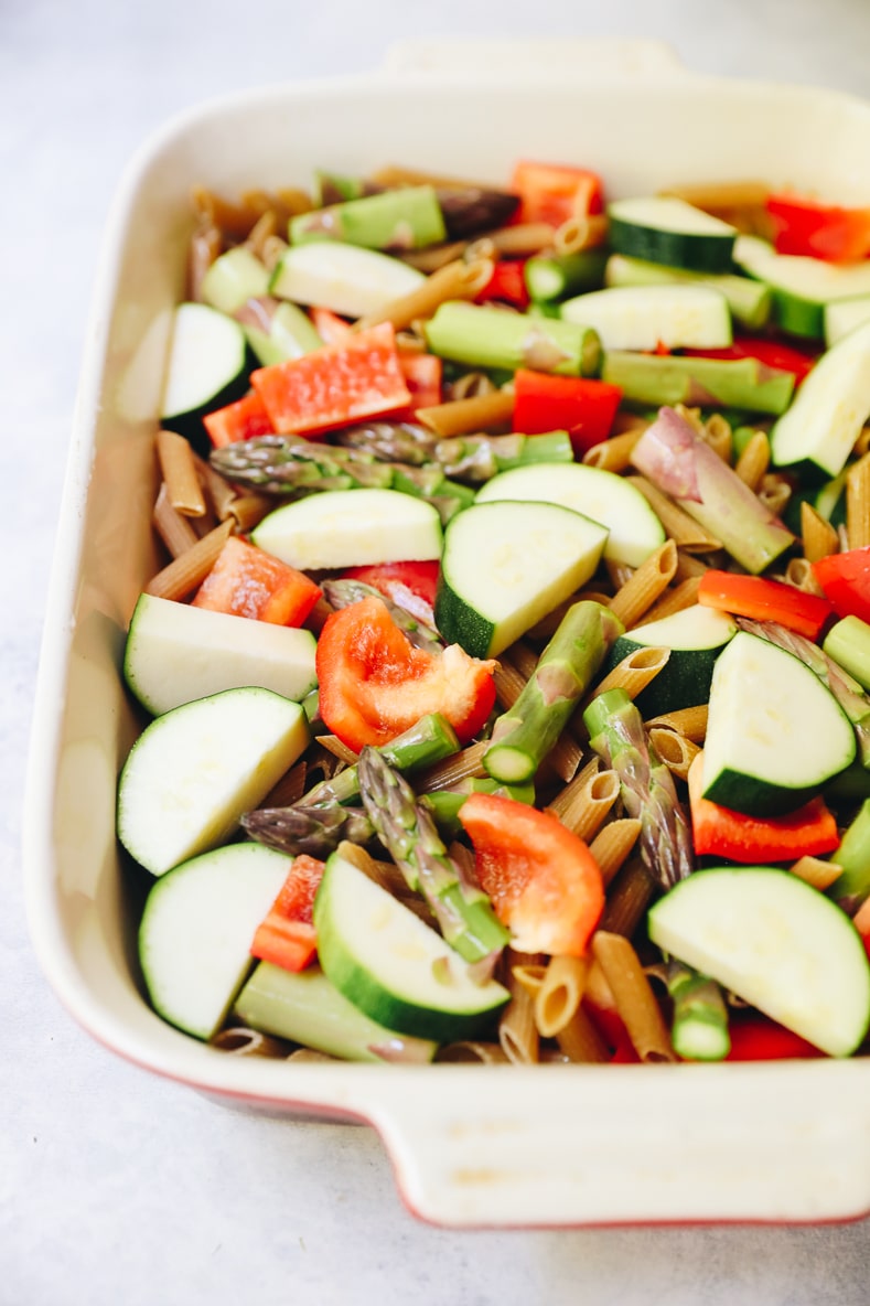 Pasta primavera is an Italian-American dish which combines pasta and fresh Spring vegetables. “Primavera” means “Spring” in Italian so traditionally this dish is made with spring veggies which vary depending on where you live. Here is California (which is pretty much Spring year round) we’ve included vegetables like asparagus, squash and bell pepper. This pasta bake can also be made with whatever veggies you have on hand. More on this below.