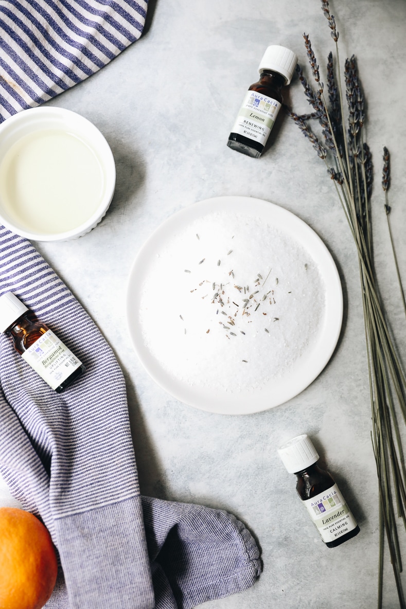 - 10-20 drops of your favorite essential oil: the list is endless but I really like eucalyptus (for that spa-like experience), lemon or other citrus essential oil (like grapefruit) and lavender essential oil (for relaxation).