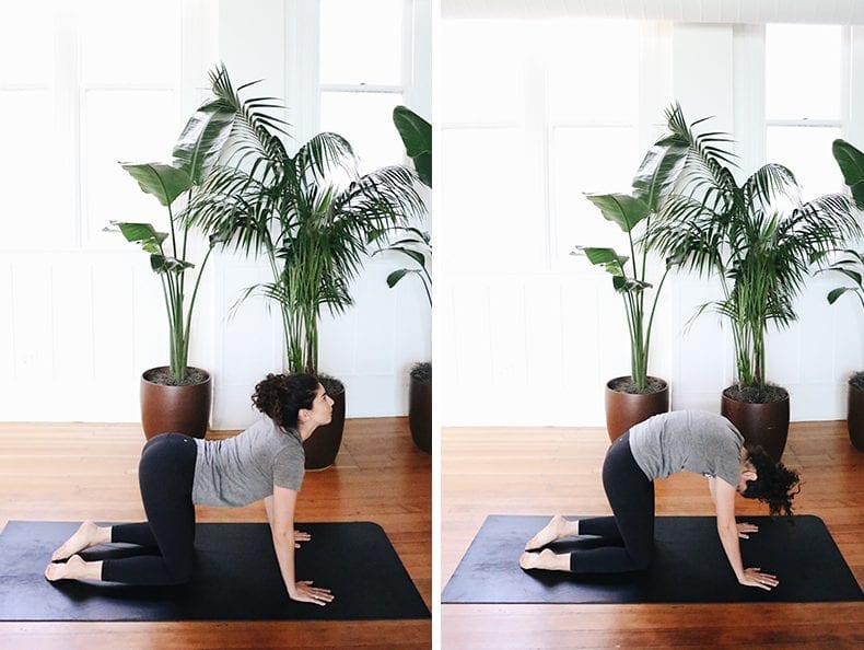 What it is: Come onto all fours. Plant your shins and palms firm into the mat with all 10 fingers spread wide. Keep your knees at a 45 degree angle and your shoulders over your hands. Inhale and begin placing a curve in your back bringing your navel to the earth and your heart open in front of you (cow). On an exhale reverse the movement bringing an arch into your your spine pulling the center of your spine up to the ceiling (cat). Repeat x 3 or as desired.