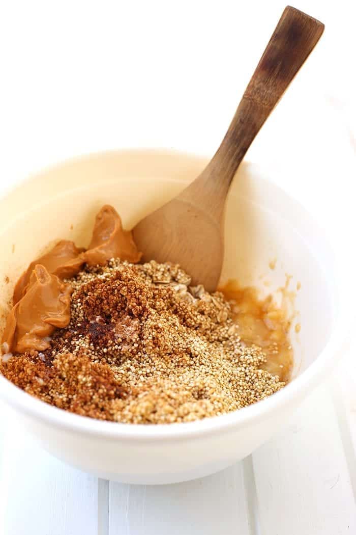 In a large bowl, combine rolled oats, quinoa, baking powder, cinnamon and salt. Add in the mashed bananas, flaxseed, peanut butter, coconut oil and maple syrup. Stir until well combined. Stir in any optional add-ins and let the mixture sit for 10 minutes so the flaxseed can absorb some liquid.