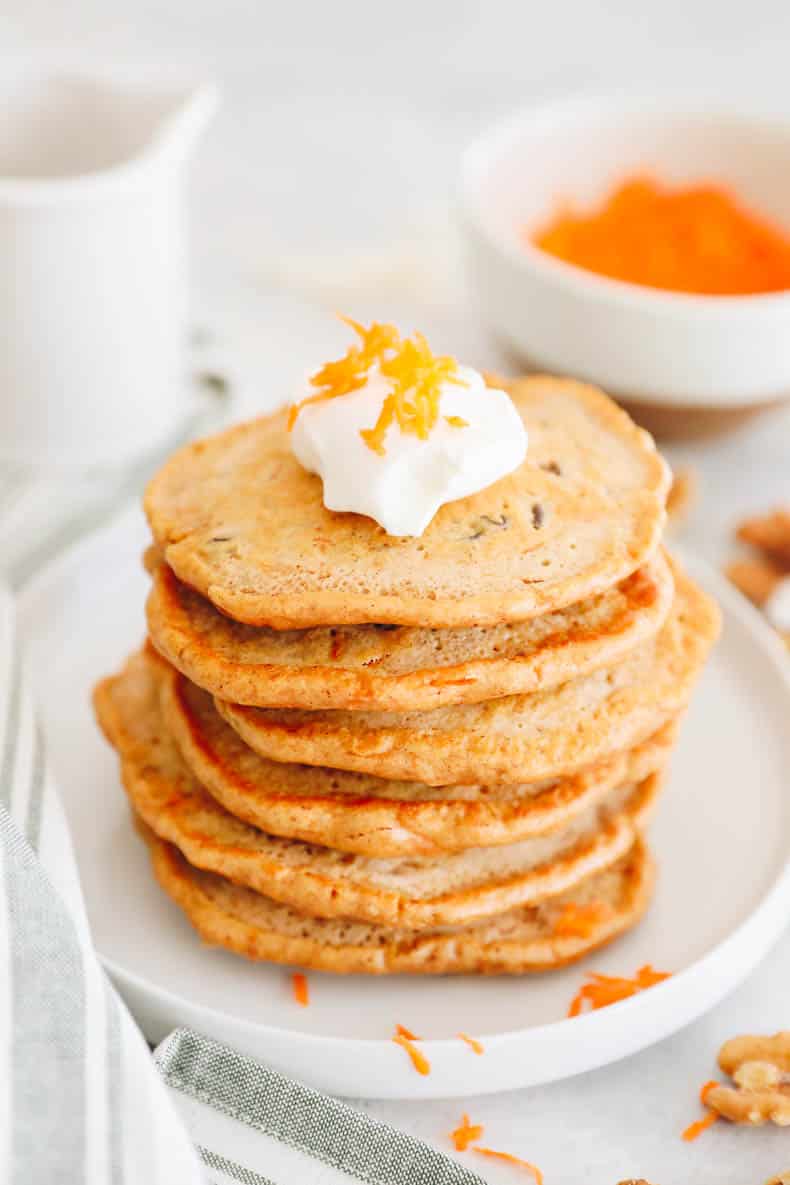 Great for Meal Prep. These carrot cake pancakes freeze super well so they’re a great thing to meal prep one day to have a healthy prepared breakfast.