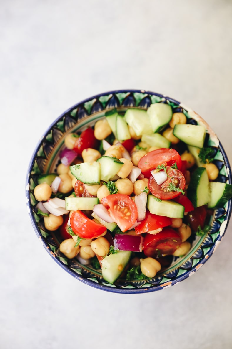 STEP 4: Assemble salad by combining cucumber, tomatoes, red onion, chickpeas, parsley and lemon juice. Top with sea salt and combine.