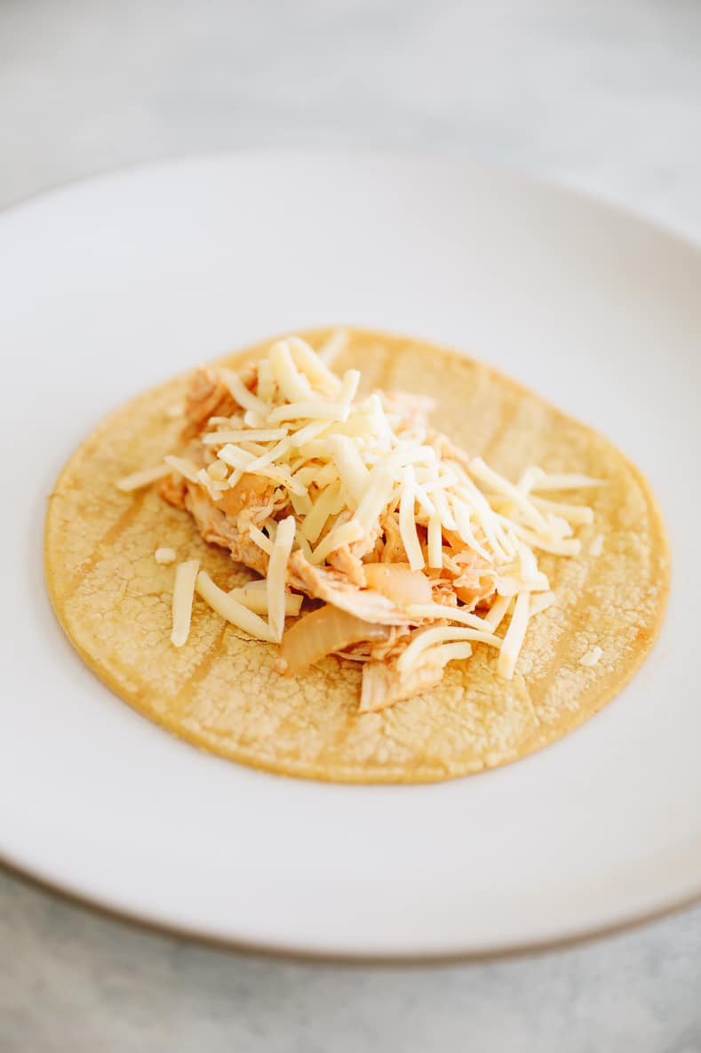 STEP 3: Preheat oven to 425 degrees F. Grease a baking sheet with spray or olive oil. Place corn tortillas on a plate and place a sheet of paper towel between every two tortillas (6 paper towel sheets total). Microwave for 30-60 seconds. *See comments below if you don’t have a microwave. Place about a 1/4 cup of the chicken mixture along the center of each tortilla. Sprinkle with roughly 2 tablespoons of cheese.