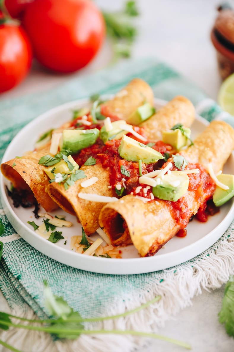 - Top taquitos with salsa, avocado (or guac) and optional toppings for serving.