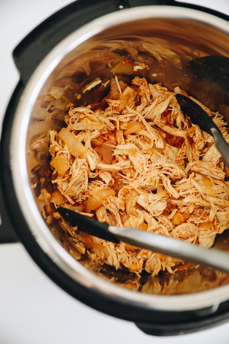 STEP 2: Quick release vent when chicken is done, remove top and use two forks to shred chicken. Add in lime juice and stir to combine.