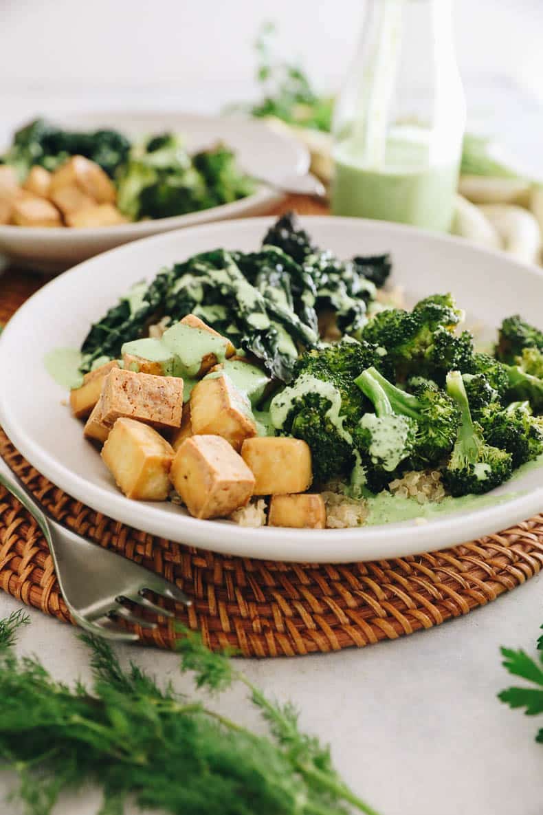 - Divide cooked quinoa evenly in bowls and top with tofu, broccoli and kale. Drizzle with green goddess sauce.
