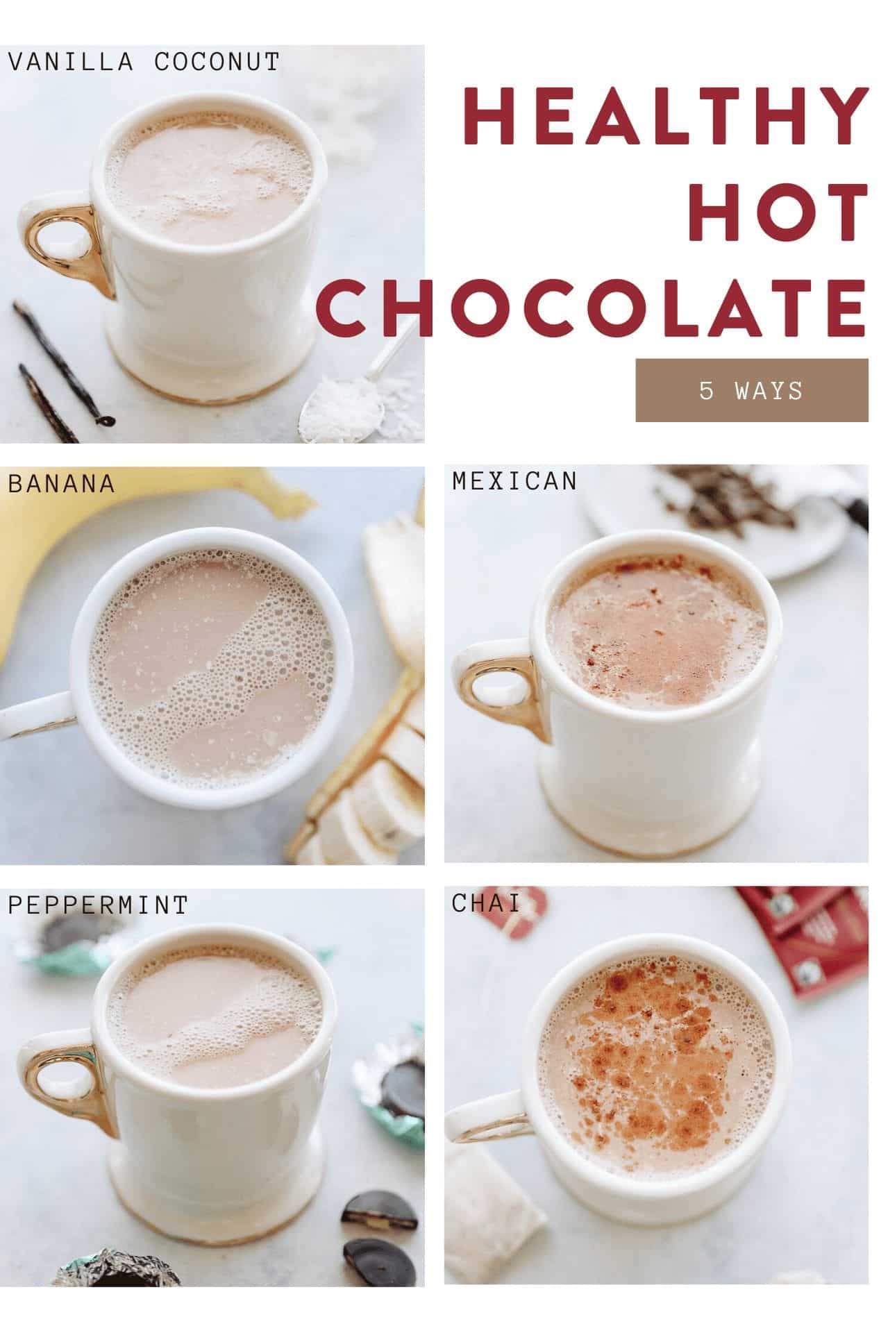 Looking for a healthy hot chocolate recipe? Look no further than these 5 healthy versions including banana hot chocolate, peppermint hot chocolate, chai hot chocolate and more! All made with healthy, nutritious ingredients that you probably already have in your pantry!