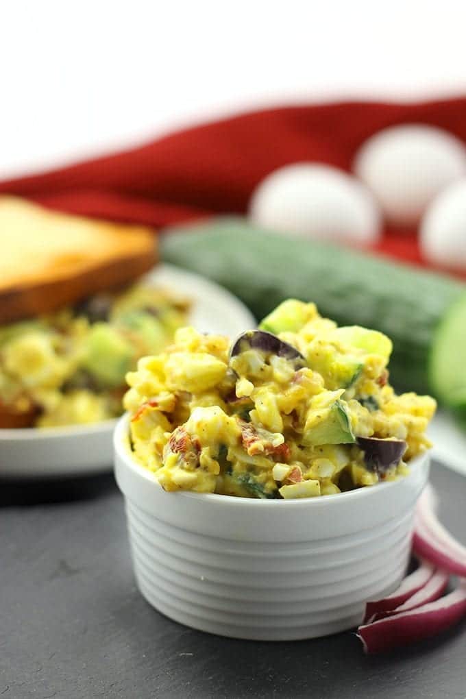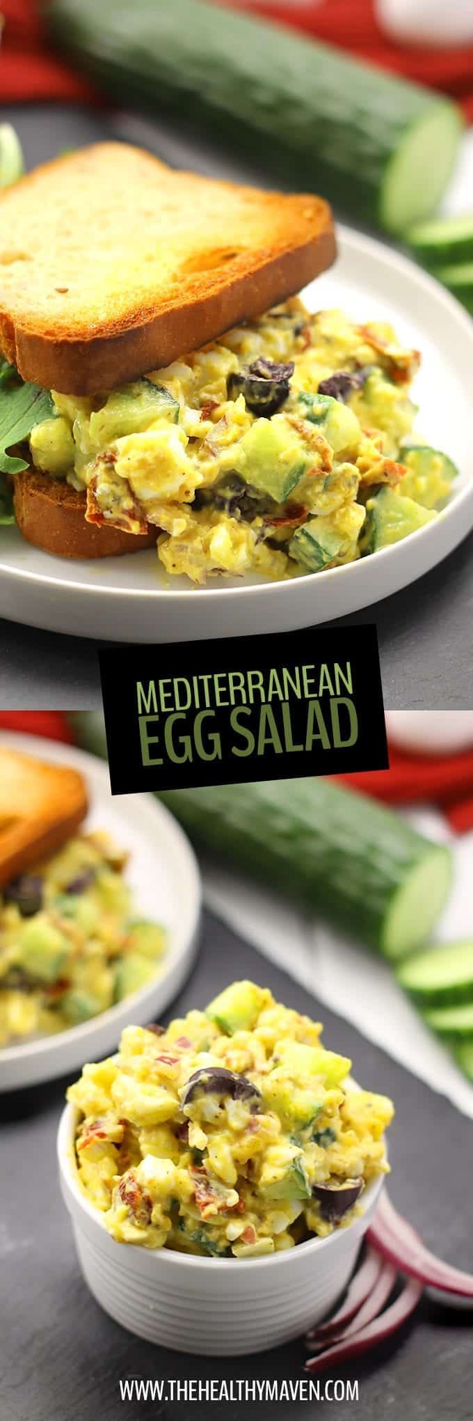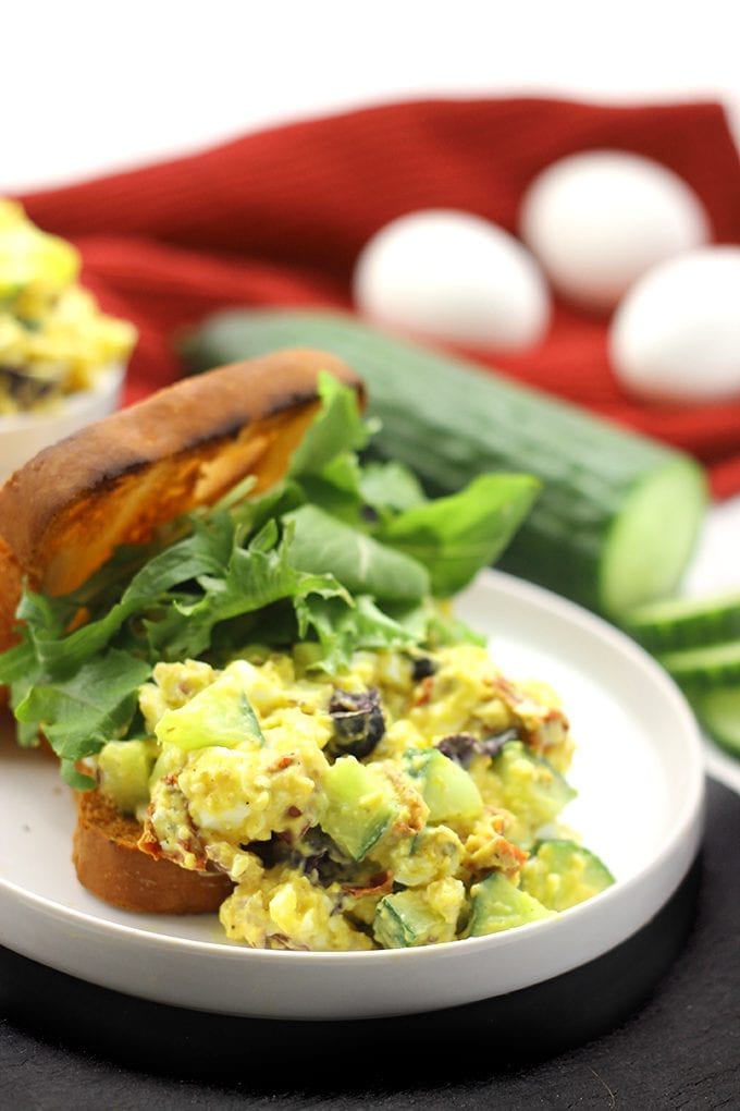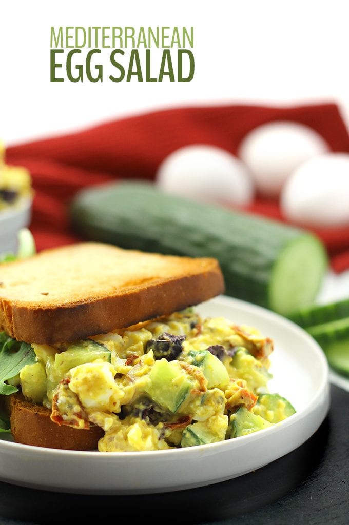 Change up your lunch routine with this healthy and nutritious Mediterranean Egg Salad recipe. It’s lightened-up with greek yogurt and packed full of flavor with olives, sun-dried tomatoes and cucumber. Perfect for lunch on the go!