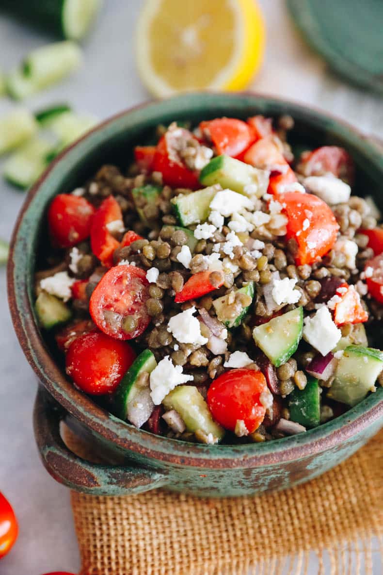Customize your veggies. This lentil salad is inspired by a Greek salad with fresh tomatoes, cucumbers, red onion and feta. That being said the veggies can easily be replaced with whatever you prefer or have on hand.