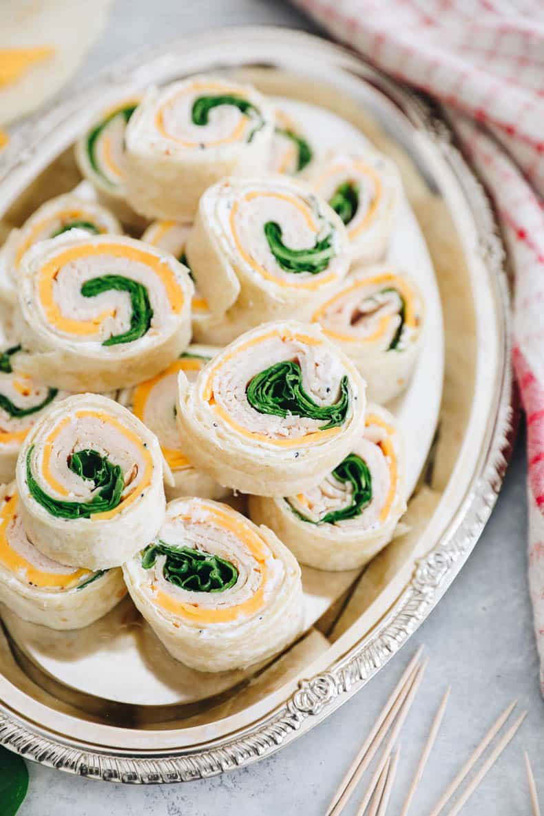Add pickles – I love adding the acidity of pickles to my turkey pinwheel sandwiches. I’d recommend using sliced bread and butter pickles.
