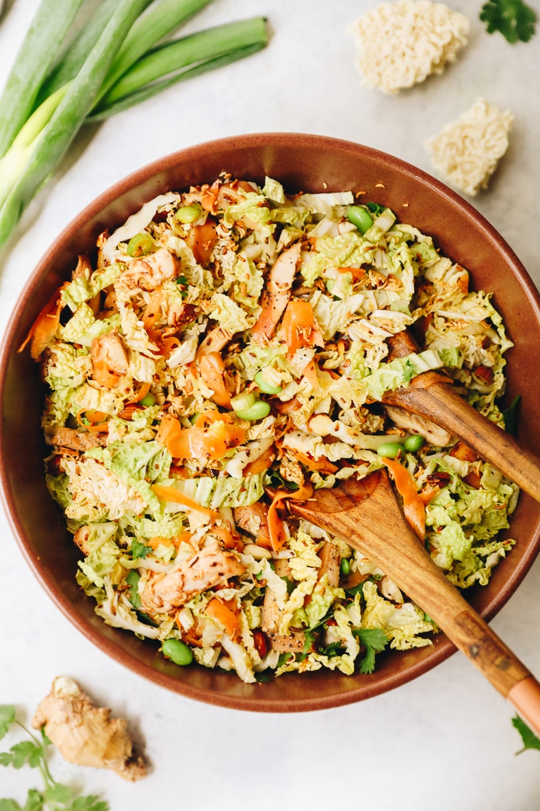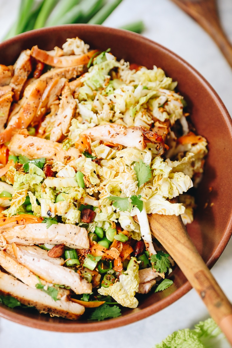 Change up your usual boring salad with this crispy and flavorful Chinese Chicken Salad recipe! Made with crunchy napa cabbage, crispy ramen noodles and a delicious asian dressing this salad will become a weeknight staple and family favorite.
