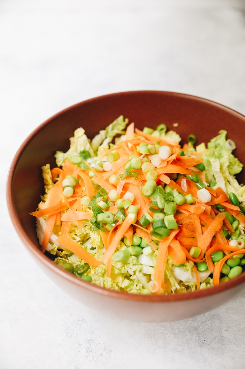 - Combine cabbage, carrot, edamame and green onions in a large salad bowl.