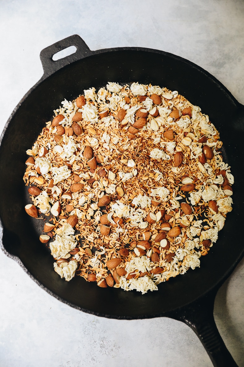 - Heat a skillet over medium-high heat and add almonds. Cook for about 2 minutes and then add ramen noodles to toast for another 2 minutes or starting to brown. Add sesame seeds and cook for 1 more minute or until everything is lightly browned.
