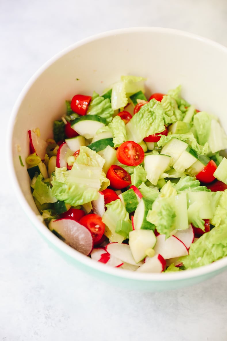 - Meanwhile, combine all chopped veggies in a large bowl (cherry tomatoes, cucumber, romaine, radishes, scallions, parsley + mint). Stir well.