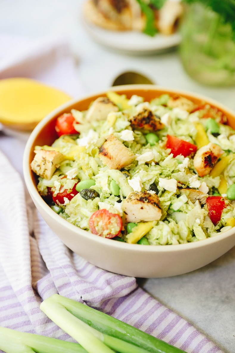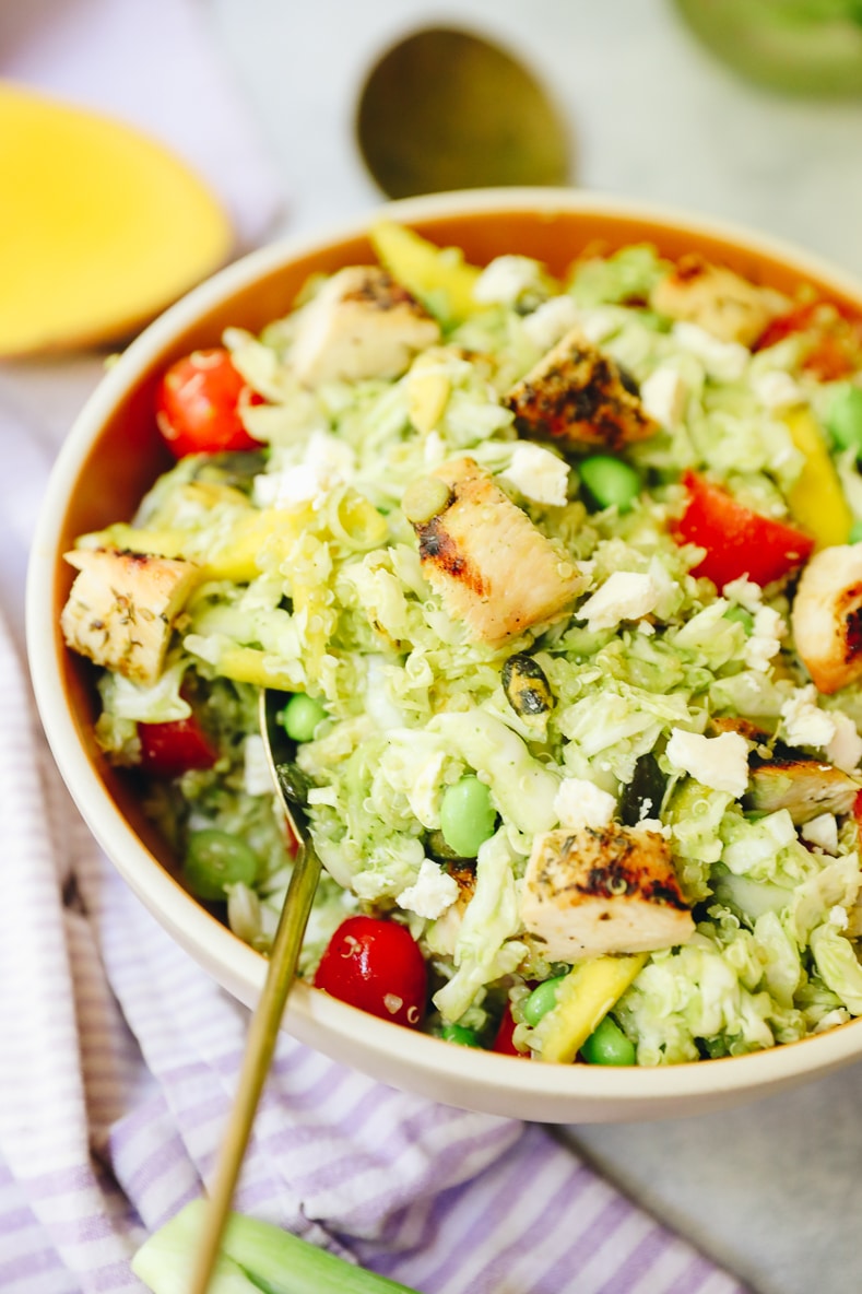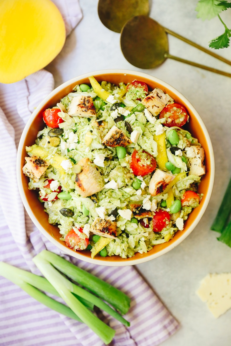 This salad has 3 main components: the veggie/grain portion, the chicken + the cilantro jalapeno dressing. You could swap out the chicken if you’re vegetarian and replace it with something else (or skip all together) but I recommend it if you eat chicken.