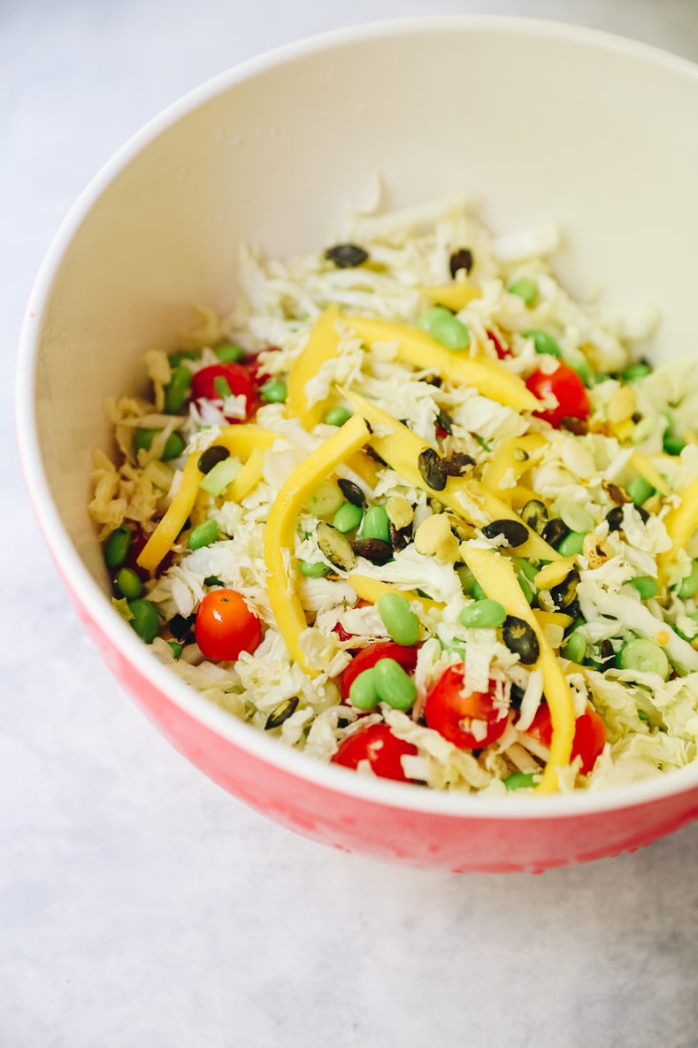 The pacifica salad is named after my favorite salad from Mixt. It’s a combo of a traditional salad and a grain salad. I love that it uses cabbage as the base but is also mixed with quinoa for a more hearty meal. I honestly have no idea why it’s called the Pacifica salad. Pacifica, California is one of my favorite places in the world but I’m not entirely sure how it connects to this salad. Its got a really interesting combo of fresh ingredients that I suppose are “California” cooking to some degree. But mostly it’s just the name for the salad and I’m sticking with it.