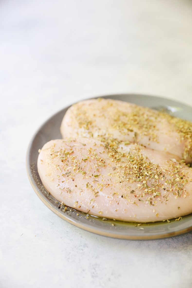 STEP 1: Marinate chicken in olive oil, salt, garlic powder + Italian seasoning. Let sit at room temp for 20 minutes.