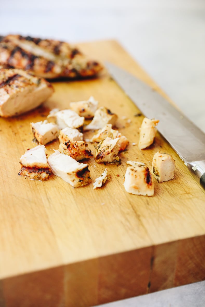 STEP 5: Cook chicken on your grill (instructions below) or on a grill pan inside – instructions here. When finished allow chicken to cool slightly and then cut into cubes.