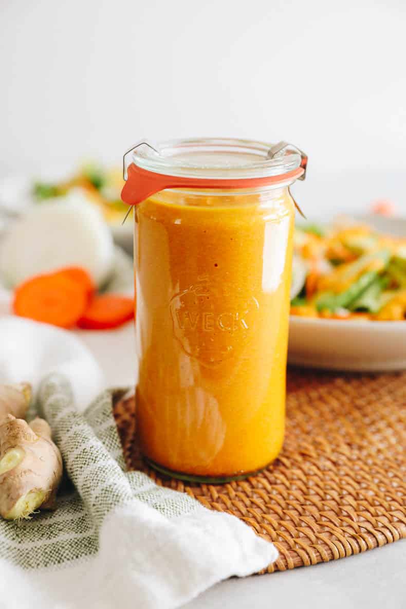 Fresh ingredients – This ginger salad dressing uses fresh ingredients and is veggie-packed including carrots, bell pepper and fresh ginger root!