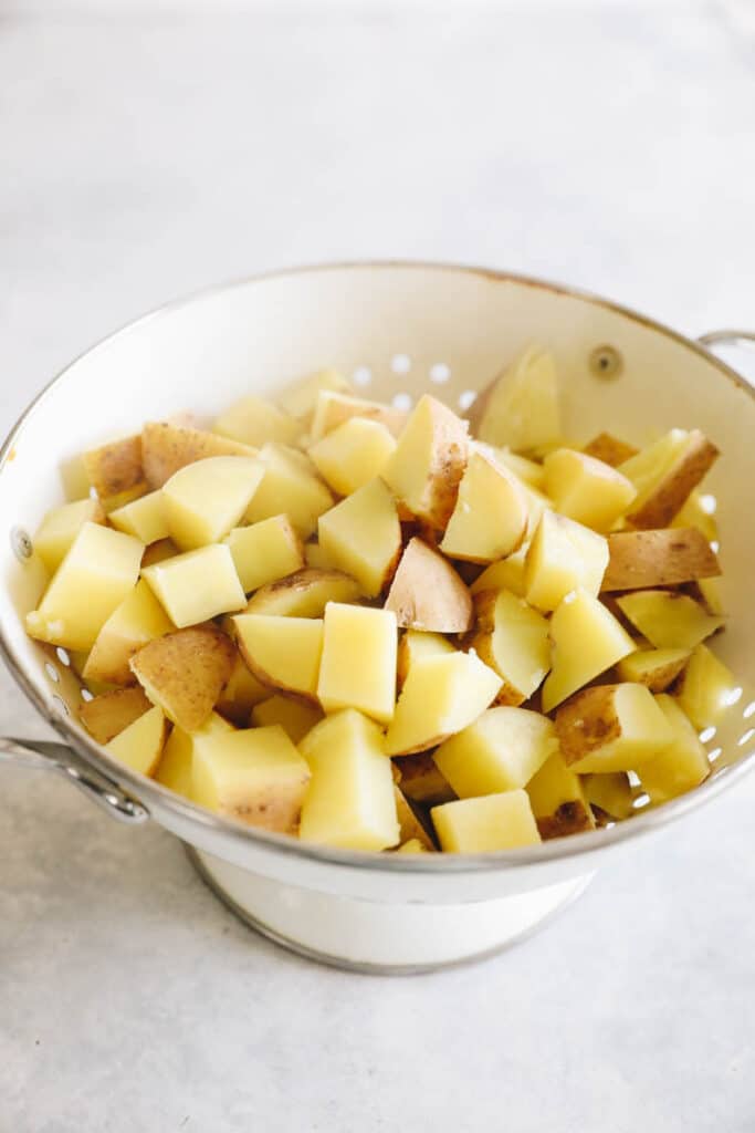 - Strain potatoes into a colander and then spread out on a parchment or silicone lined baking sheet.