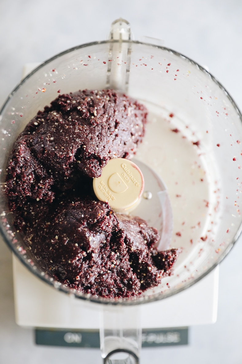 STEP 2: Combine nuts with dates and dried blueberries and process until all ingredients have broken down and are a bit sticky.