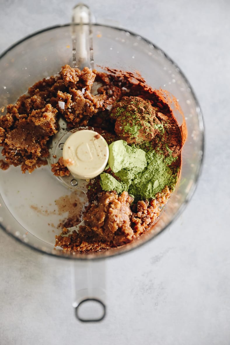 STEP 2: Break up the ball a bit and add in the cocoa powder, matcha powder, salt and almond milk. Process until all of the ingredients have been combined and one large, sticky ball is formed – around 2-3 minutes.