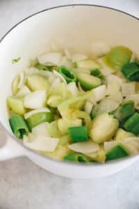 Add olive oil to your pot or dutch oven over medium-high heat. Add your tomatillos, white onion, garlic cloves and poblano peppers. Cook until lightly browned (around 10 minutes).