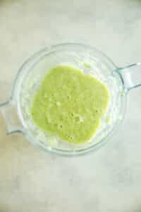 - Add all ingredients from your pot (tomatillos, onion, garlic and poblanos) to a blender and add in handful of cilantro leaves (skip if you don’t like cilantro). Blend until smooth.