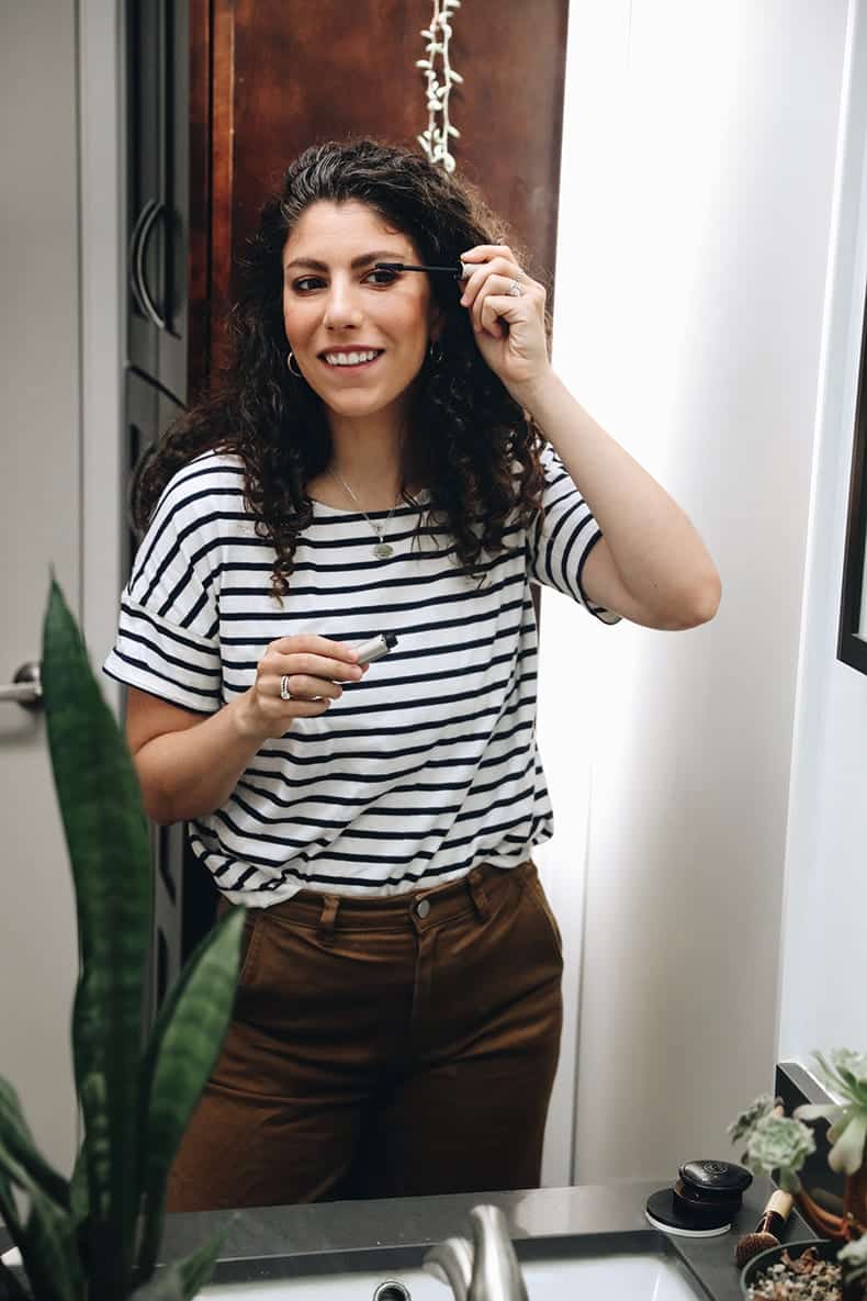One quick discussion before we jump into the best natural mascaras. Truth be told there’s nothing suuuuper natural about natural mascaras. The options below are still safer than conventional mascara in that they use safe synthetics and won’t mess with your endocrine system BUT many of the ingredients are synthetic and/or use chemicals and not the plant-derived materials you find in other clean makeup (waxes are particularly common). That being said the products I love are still 100% safe for your body, long-lasting, cruelty-free and paraben-free. That’s a start!