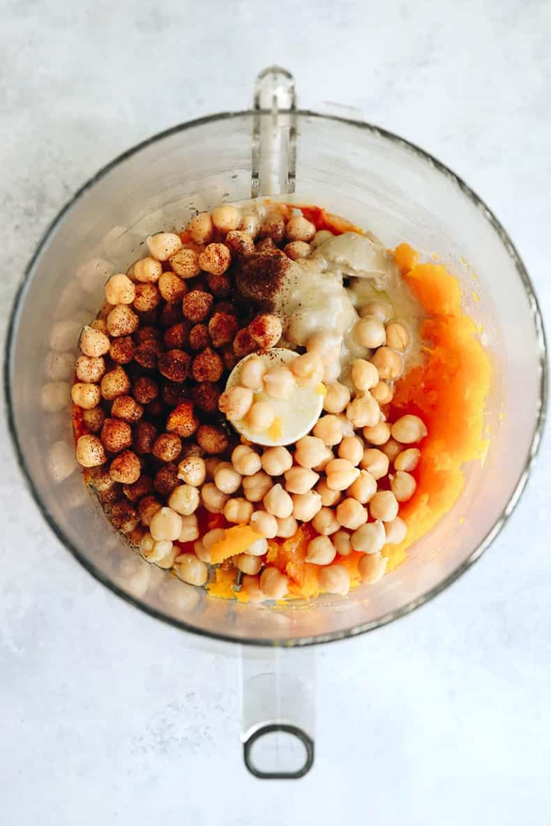 - Add butternut squash, 1 1/2 tbsp olive oil, chickpeas, tahini, garlic, lemon and water to a food processor or blender and process until smooth.
