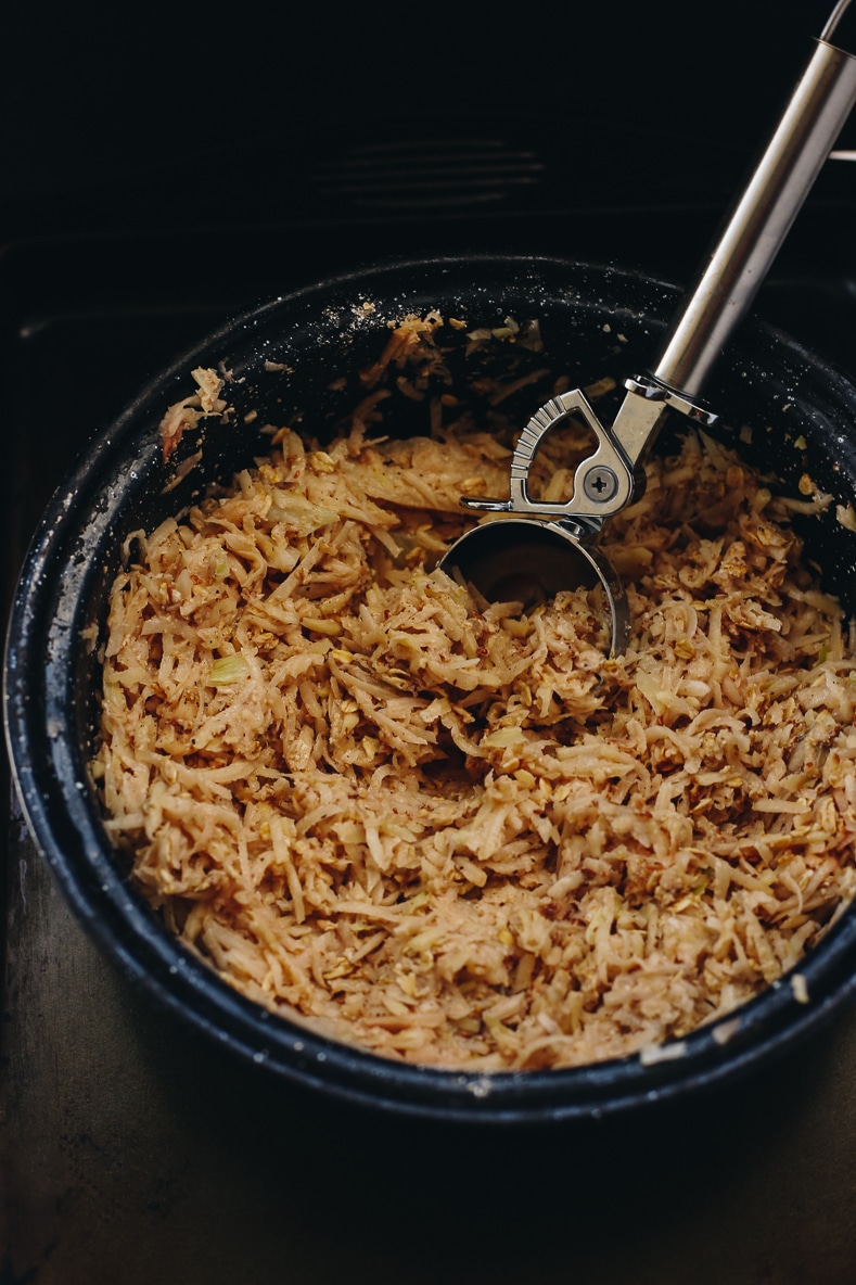 STEP 1: Prep your ingredients. If you haven’t already, make your flax egg. Grate the potatoes using a cheese grater or food processor. Place the potatoes inside a dishcloth or cheesecloth to squeeze out the excess liquid. Grate the onions with the cheese grater or food processor (no need to squeeze the liquid out of the onions).