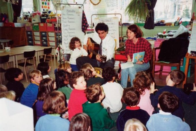 I have to give credit to my parents who went out of their way to bring Hanukkah to my school by showing up with dreidels, latkes, jelly donuts and my guitar-playing Dad to make me feel a little less alone. Here’s a little gem from our glory days: