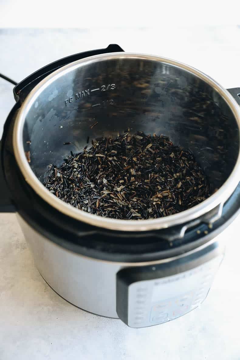 Yes you can definitely cook wild rice in an instant pot! It is much faster as well. You’ll want to reduce your liquid ratio so its 1.5:1 liquid : wild rice. For this wild rice pilaf recipe you’ll combine 1 1/2 cups of stock with 1 cup of wild rice. Add salt. Set Instant Pot to pressure cook for 20 minutes. Allow slow release for at least 10 minutes. Strain any remaining liquid.