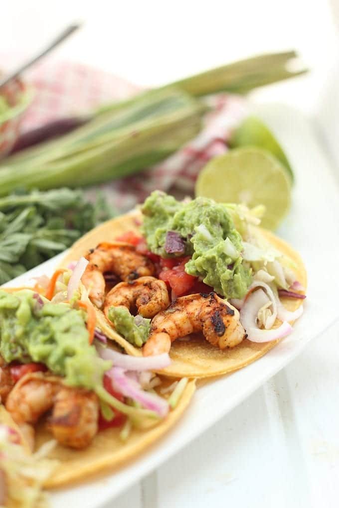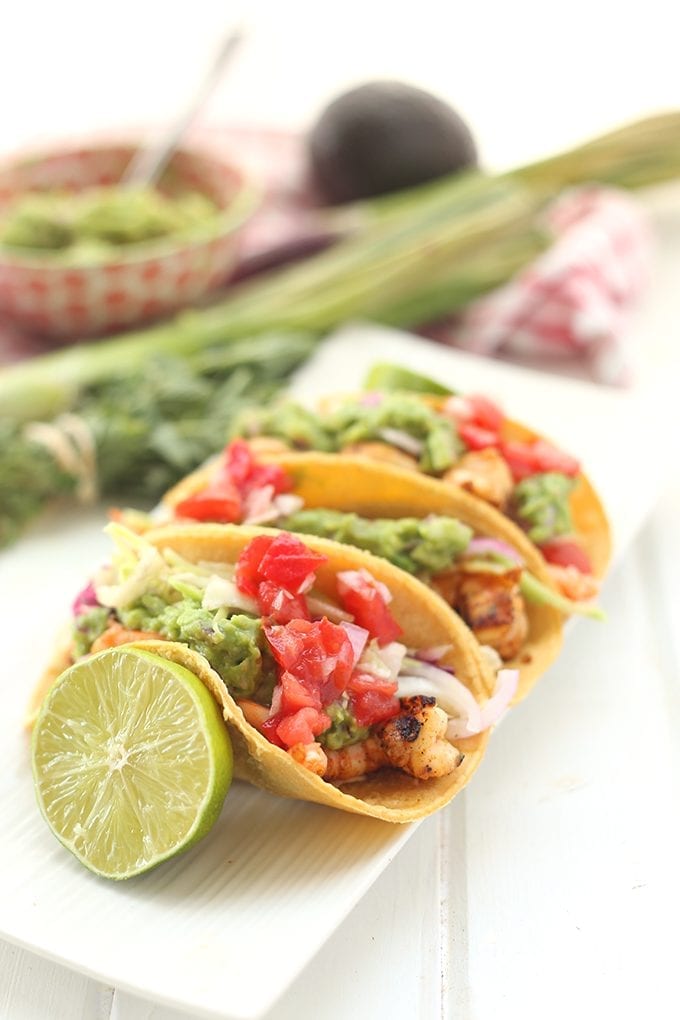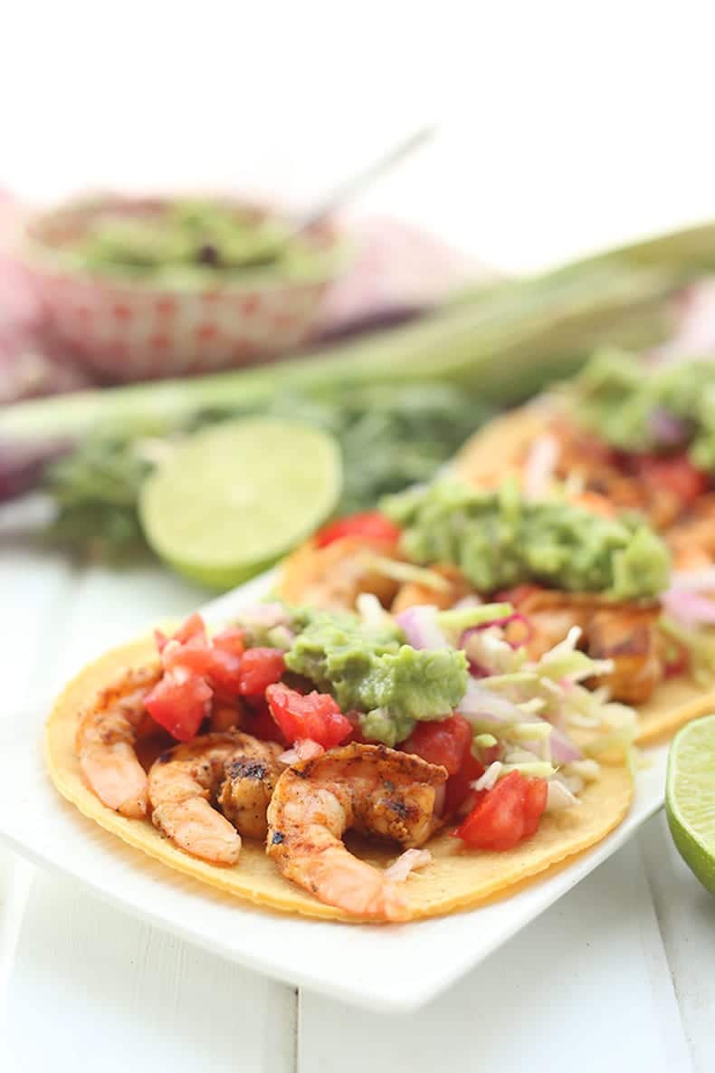 Enjoy a Mexican-themed dinner with these Spicy Grilled Shrimp Tacos with all the fixins. Perfect for a weeknight dinner or a dinner party. No one will believe you that they’re healthy too!