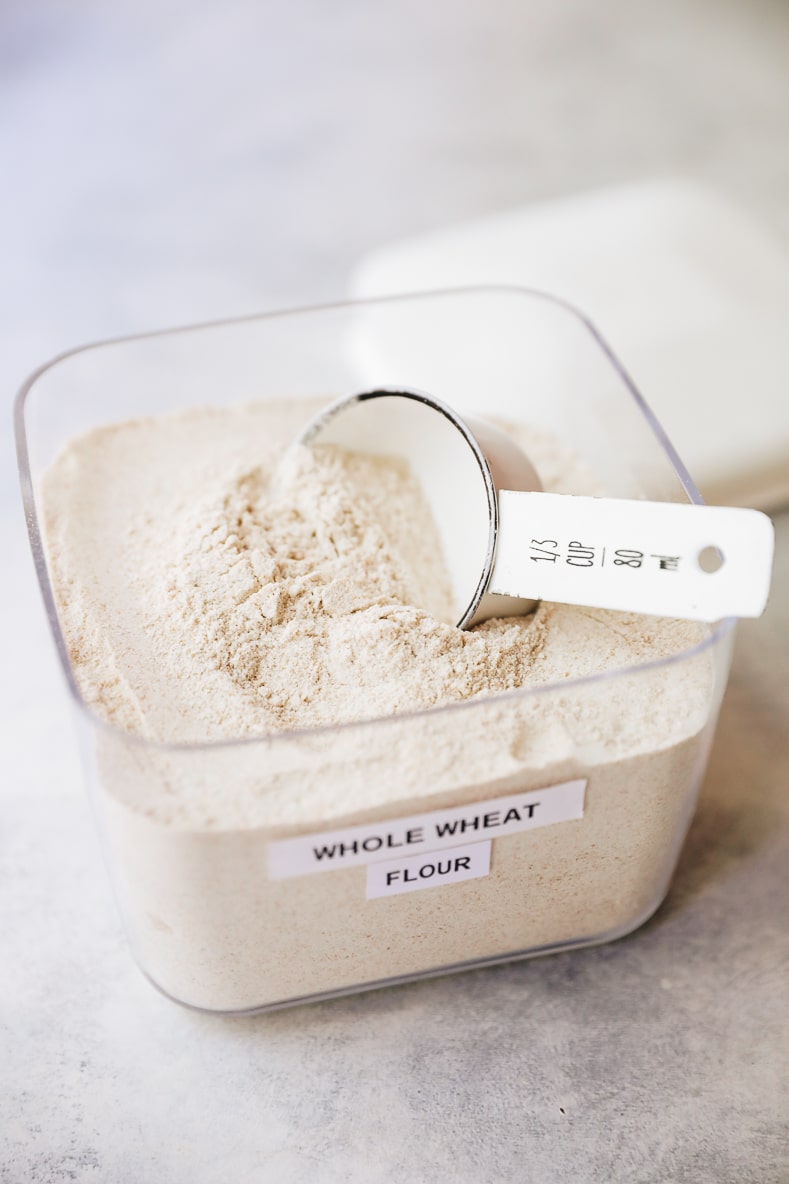 We all have those pantries where you stumble across random bags of flour, right? I have come a long way and *most* of my baking cupboard is stored in jars and labeled but I still come across surprises once in awhile. I recently found a lone bag of whole wheat flour at the back of my cupboard. I have been making a lot of whole wheat bread in the last few months and forgot I stowed some extra in the back. I immediately moved it to the front where I would have a constant reminder to use it up.