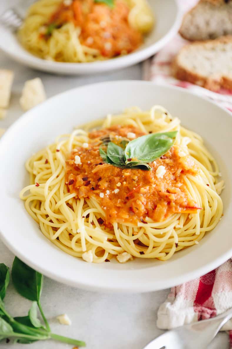 If you’re intimidated by making a homemade arrabbiata sauce, don’t be! This recipe is surprisingly easy. You can have a delicious, fully home cooked meal in under 30 minutes. Don’t get me wrong, I often grab a jar of pasta sauce for an easy weeknight dinner but after making this arrabbiata sauce recipe, it’s hard to go back to the jar!