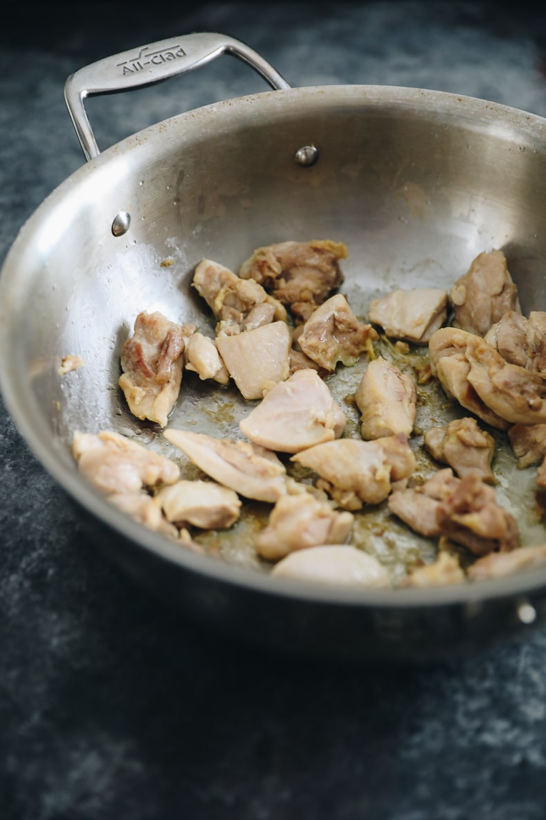 - Add sesame oil to pan followed by chicken pieces. Cook chicken, flipping occasionally until fully cooked through (roughly 5-8 minutes). Remove chicken and set aside.