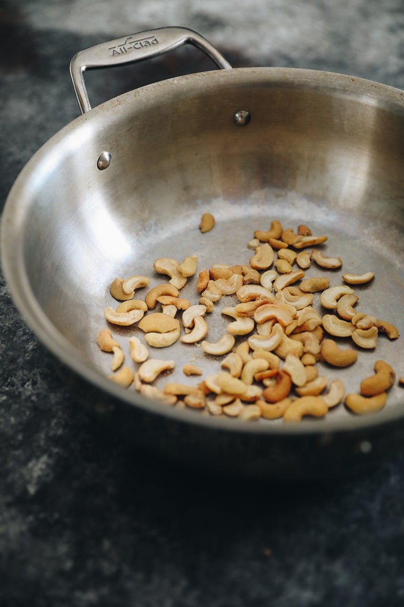 - Heat up a large pan or wok over medium heat and add cashews. Toast until lightly browned (3-5 minutes). Remove from pan and set aside.