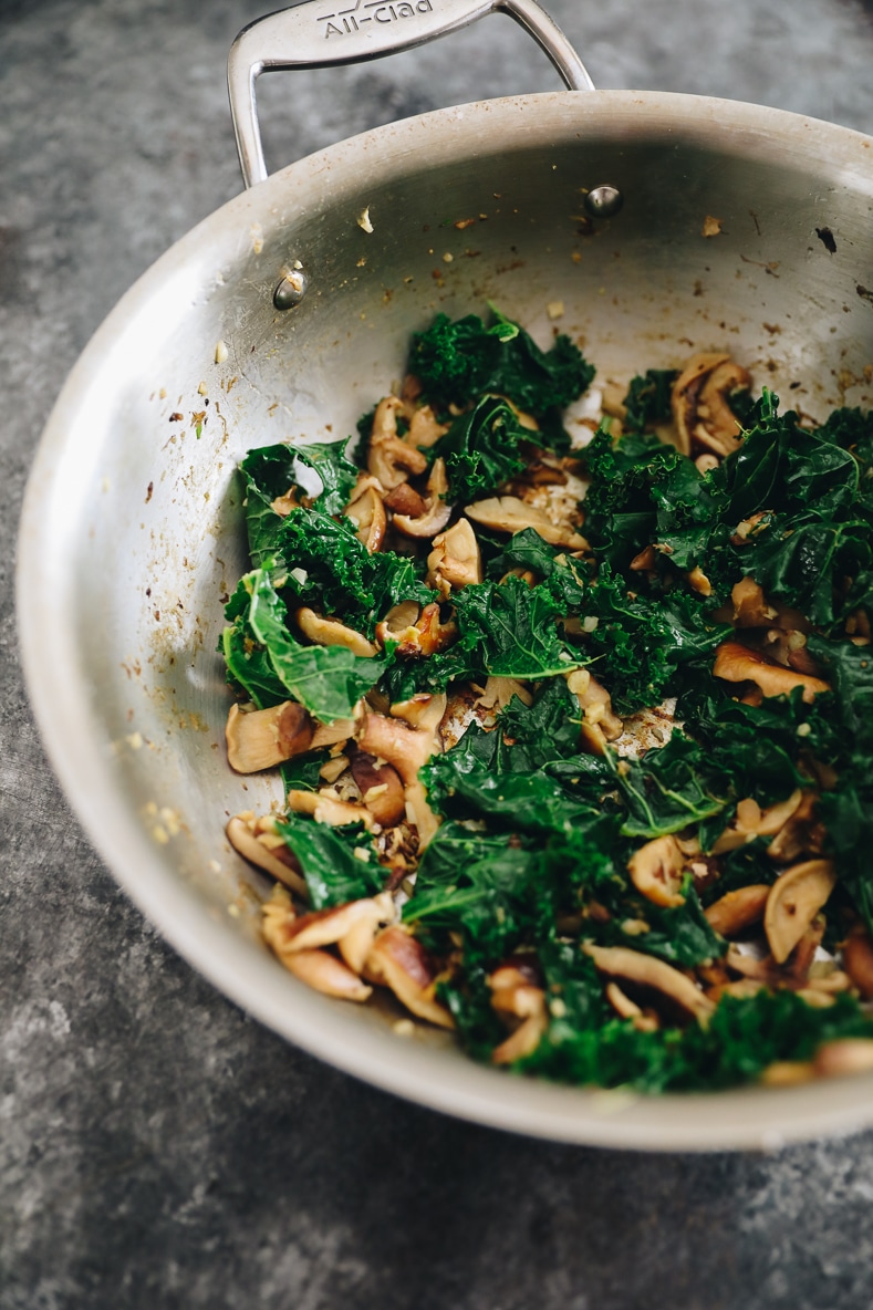 Add shiitake mushrooms to same pan. Cook for another 3-5 minutes or until mushrooms are sweating. If mushrooms are sticking add another drizzle of sesame oil. Add in garlic and ginger and cook for 1 more minute. Stir in kale until wilted.