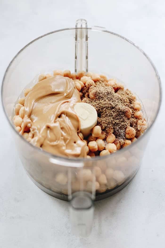 - Add the chickpeas, peanut butter, flaxseed, maple syrup, vanilla and baking soda (if using) to a food processor or high-speed blender.