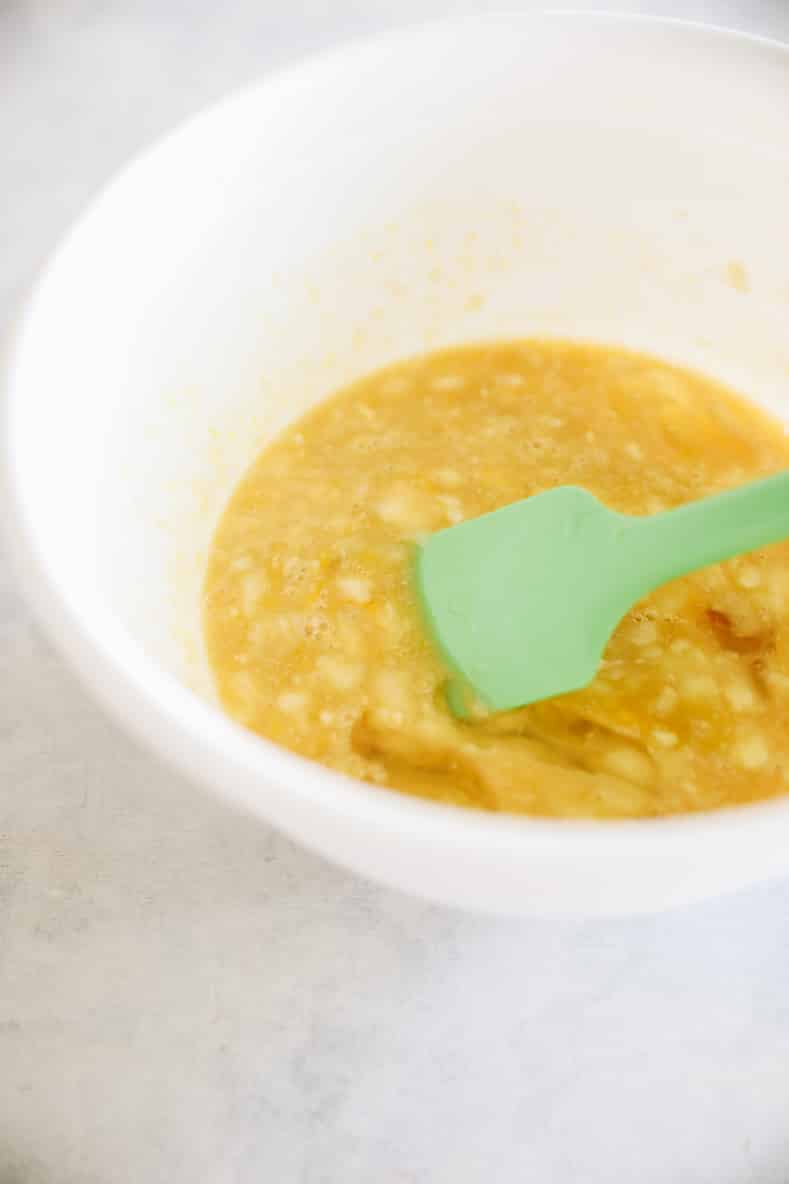 4. In a separate bowl mash up bananas and add in maple syrup and eggs.