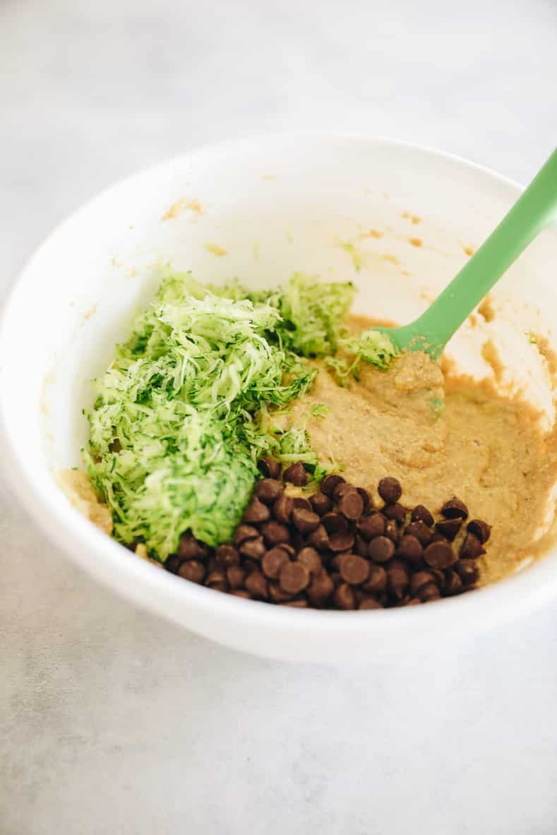 Add wet ingredients to dry ingredients and fold in zucchini and chocolate chips.